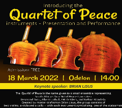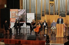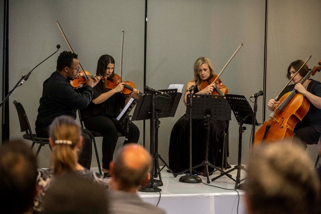 In collaboration with the Free State Centre for Human Rights, the Odeion String Quartet performed two struggle songs, Asikhathali and iBuyile iAfrika, under the theme of Social Media, Freedom of Expression and the Law: Protecting Yourself. The keynote guest speaker for the event was the Deputy Minister of Justice and Constitutional Development, Mr John Jeffrey, who presented a lecture on the topic Social Media and the Limits on Expressing Yourself. Prof Anmari van der Westhuizen, Head of the Odeion String Quartet, said in her speech that “music is one of the most powerful means of expression, whether it is a specific war, a universal plea for peace, a searing response to racism, or a celebration of a victory – everyone has the right to make music. May the Quartet of Peace instruments assist us in achieving greater inclusion and social cohesion through our music”.
