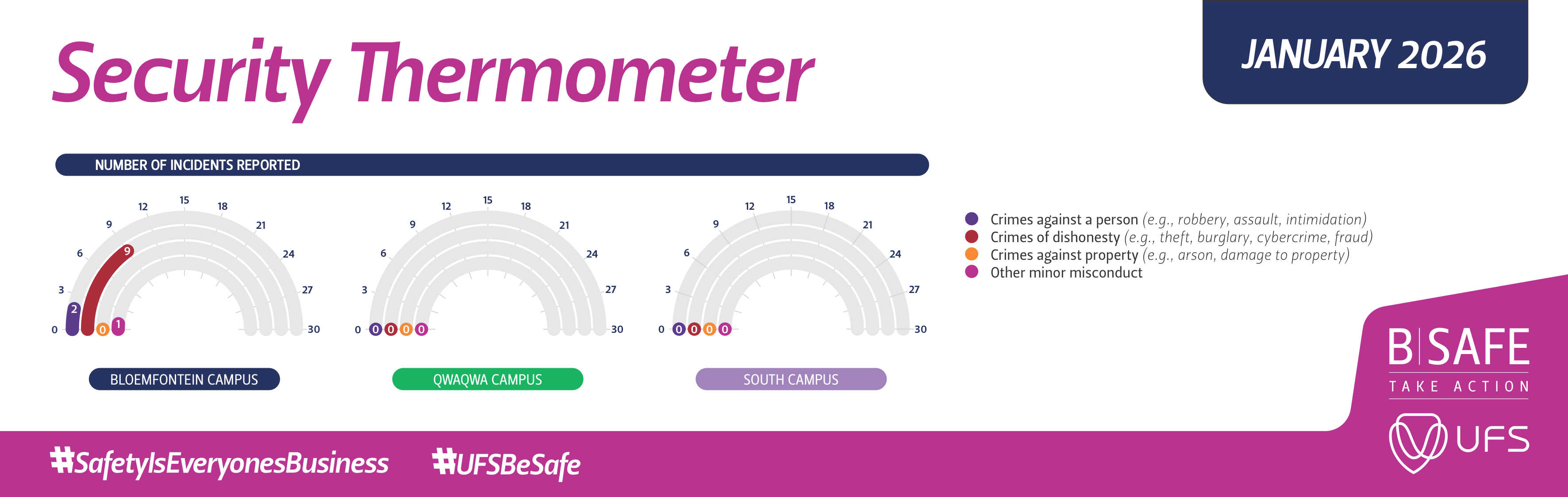 From 24/7 security patrols and surveillance systems to emergency response and support services, we strive to provide a secure and welcoming environment for everyone. We encourage all members of the UFS community to actively participate in maintaining safety – both on and off campus – by adhering to our security policies and reporting any suspicious activities.