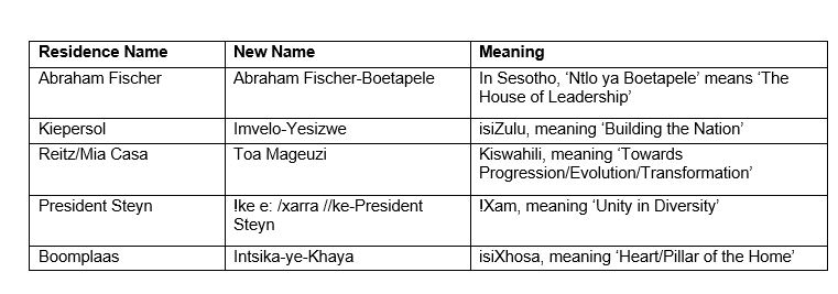 “It is in this context that the names and symbols of all 36 residences on the Bloemfontein Campus have been reviewed to ensure that the institutional culture and spaces contribute to an inclusive sense of belonging. The process was started in 2021