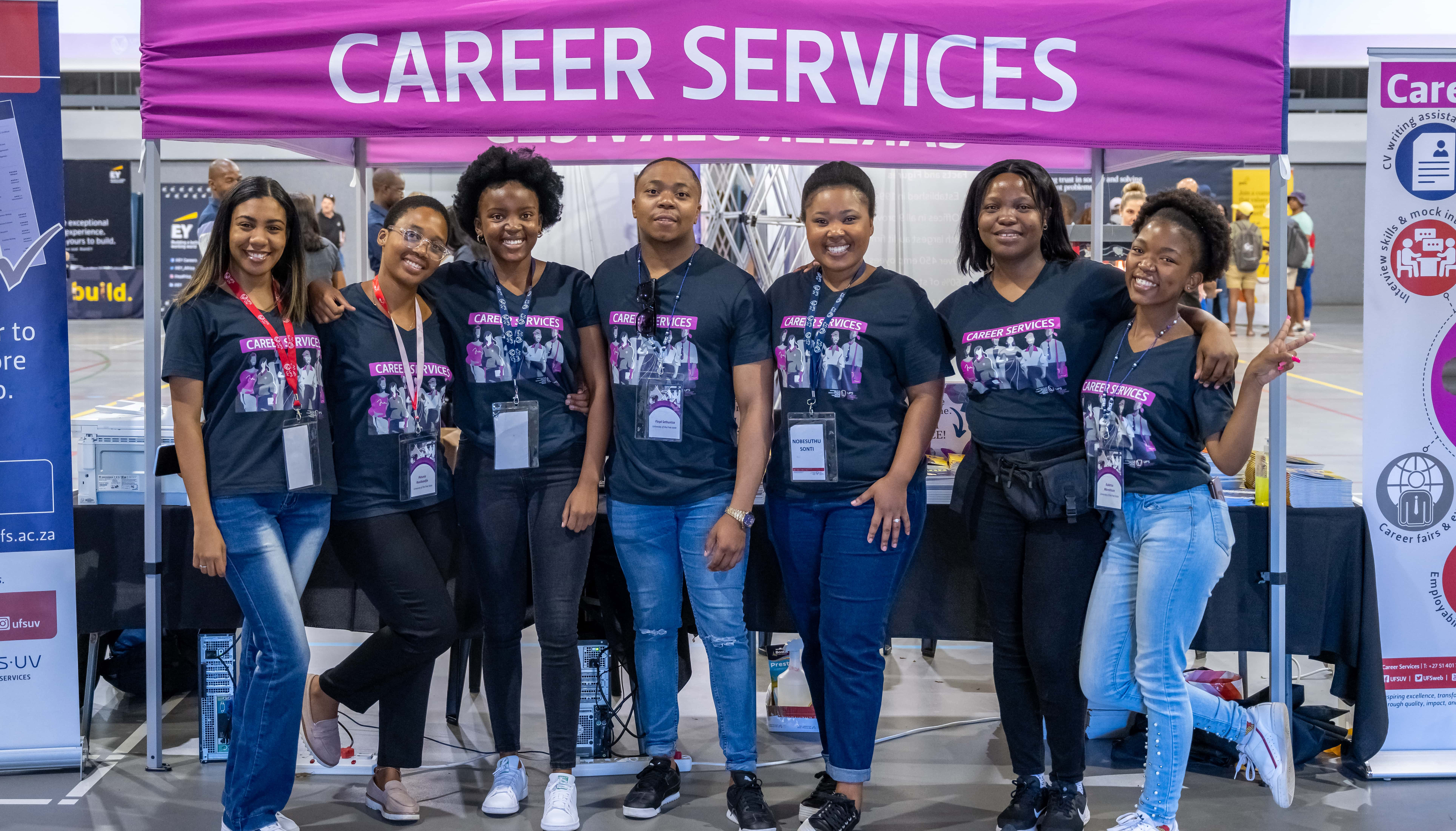 Pictured second and third from the right are Career Service’s Yolisa Xatasi, Administrative Assistant, and Nobesuthu Sonti, Senior Student Relations Officer, in a jovial mood with career ambassadors – a reminder of the value of face-to-face gatherings after the Career Fair has been hosted virtually for the past two years.